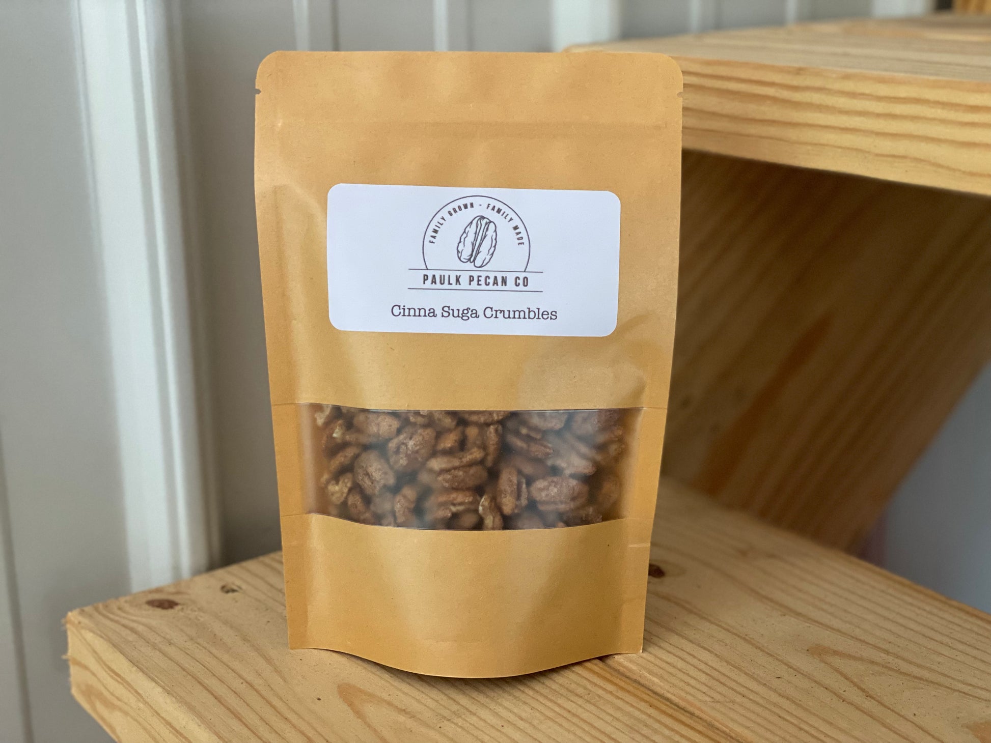 Our Crumbles are roasted pecan pieces. These have our Cinna Suga coating. Our cinna suga is the perfect mix of cinnamon and sugar with a hint of vanilla! These are great for topping yogurt or your favorite dessert! Of course, you can snack on them as well!