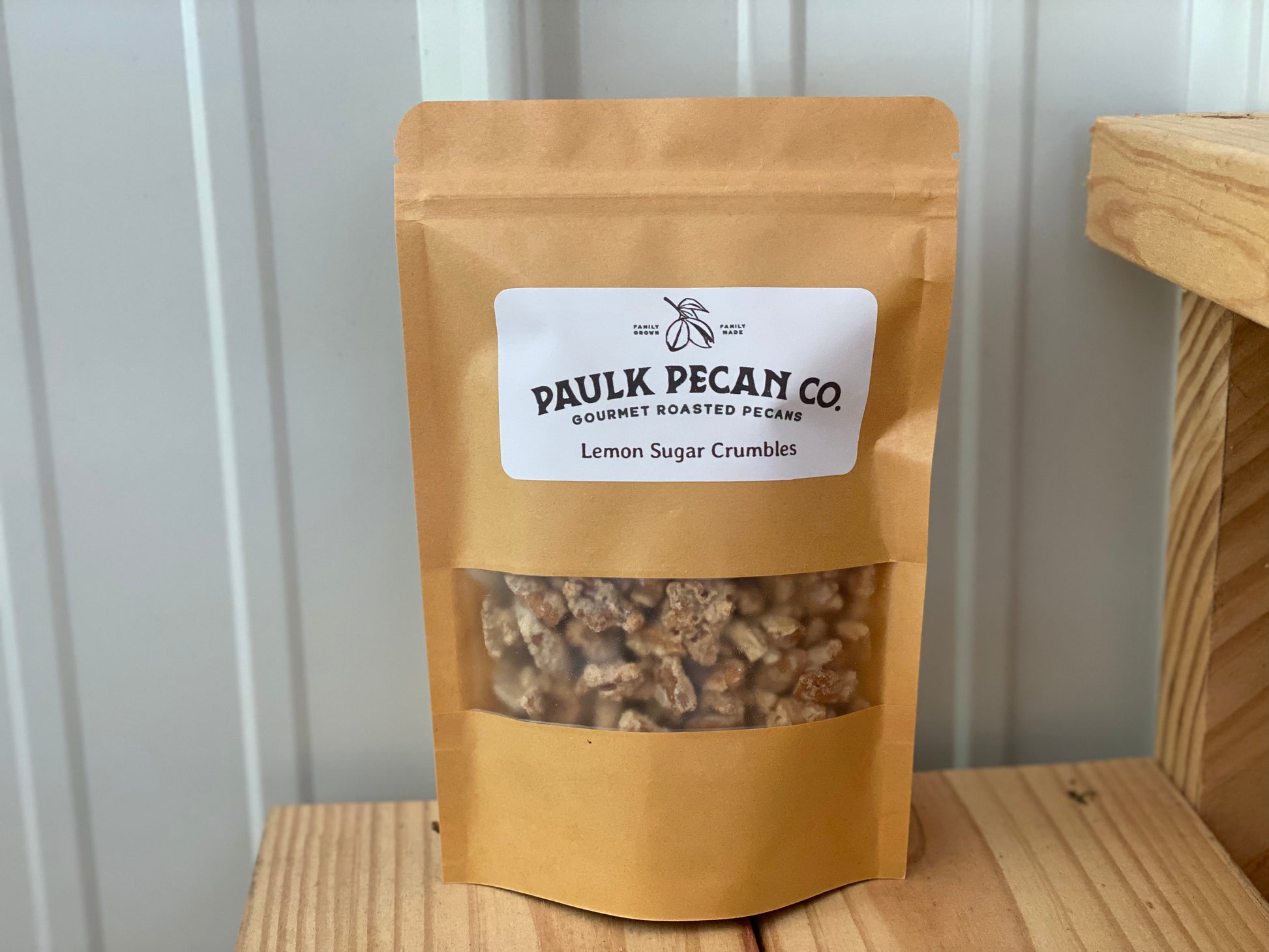 These are roasted pecan crumbles with our lemon sugar coating. Our Lemon Sugar Crumbles have a sweet sugary coating with a refreshing hint of lemon!